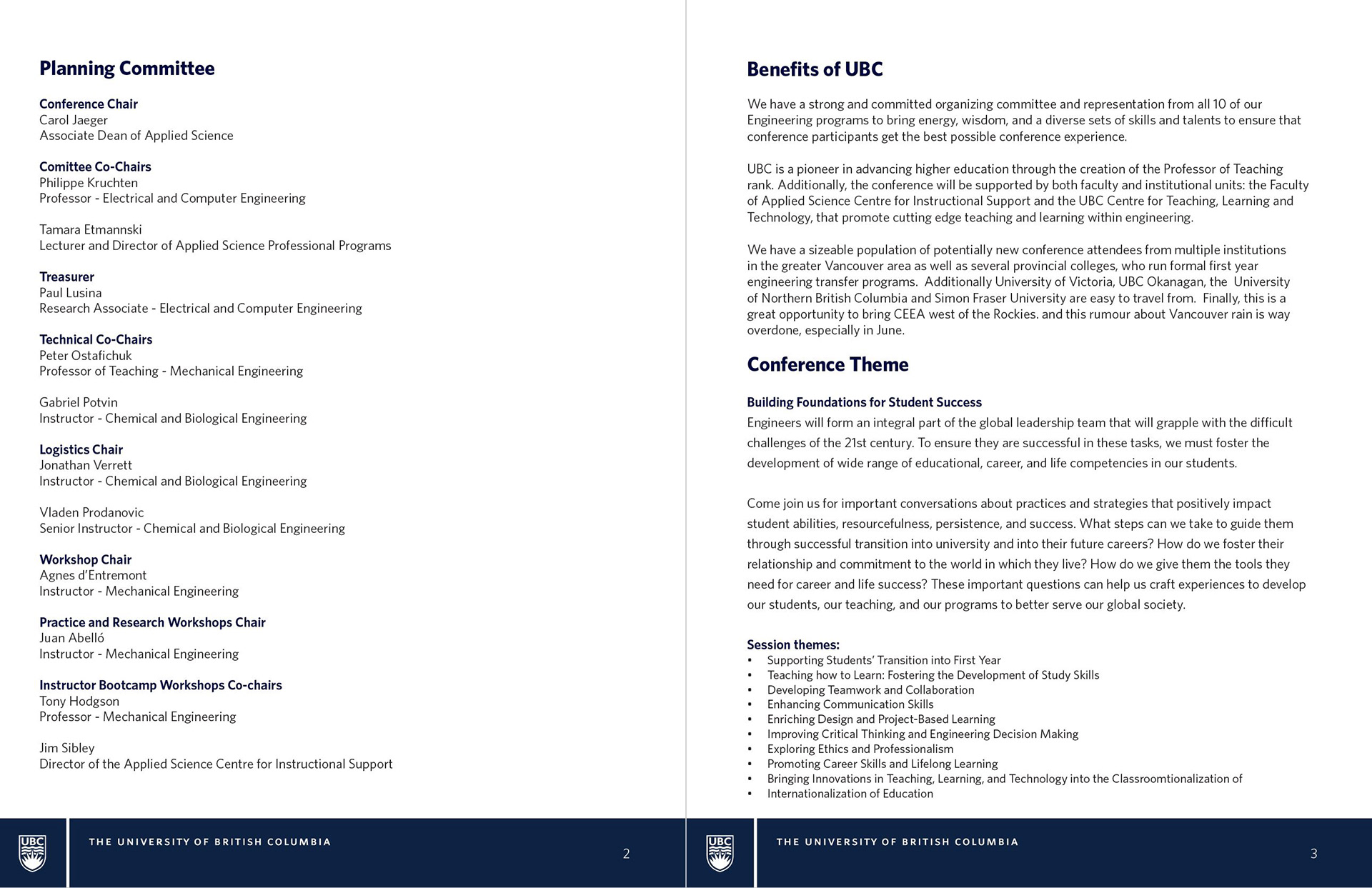 CEEA 2018 Proposal: This was the successful bid by the University of British Columbia (UBC) to host the 2018 Canadian Engineering Education Conference. It is an eighteen page document that outlines the conference themes, proposed workshops, venues, and budget. Submitted in 2017, the proposal was accepted and UBC hosted the conference in June of 2018.